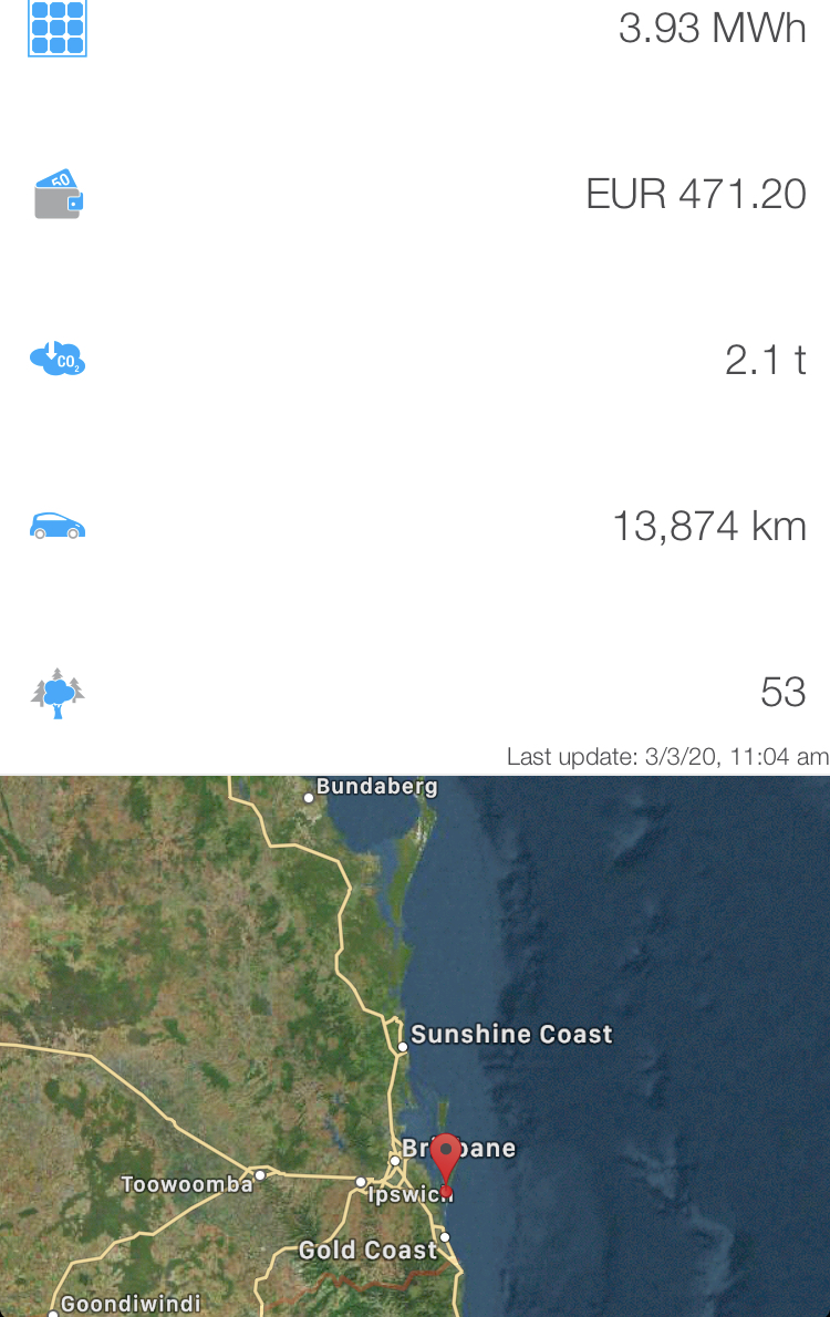 The solarweb app also displays other information regarding total system production, savings estimates and carbon benefits. There is also a map with the system location added.